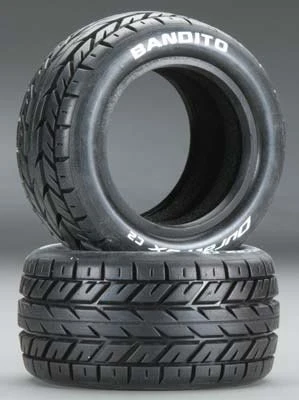 This is a pair of Duratrax Bandito 1/10 Buggy Tires For the rear of 4WD buggies FEATURES: C2 (soft) compound is comparable to Pro-Line M3 and AKA soft ratings Designed for asphalt, concrete, and hard, smooth surfaces Ideal for high traction conditions Foam inserts INCLUDES: Two tires One sheet of decals for identifying tires SPECS: Diameter: 3.3" (85mm) Width: 1.8" (45mm) 11/23/12 phijwa