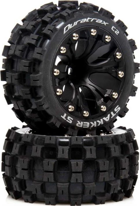 Factory-mounted with a .5 offset, these Duratrax® STAKKER™ ST front/rear tires for 1/10 scale 2WD stadium trucks feature an aggressive Motocross tread pattern that’s well-suited for racing and bashing. The wheels are molded from a durable black composite plastic with a 12mm hex and 2.04 inch (52mm) width. The tires are made from high-traction, C2 soft compound and are 4.1 inches (105.3mm) in diameter. Sold in pairs.